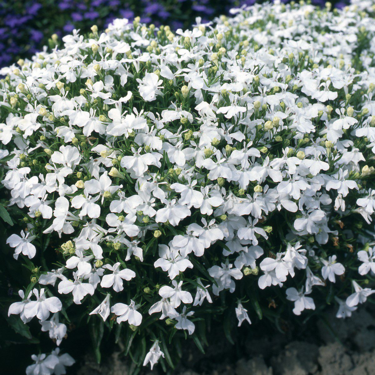 Лобелия Regatta White один из самых распространенных видов в садоводстве, который используют в ландшафтном дизайне и в качестве бордюрных растений. Потрясает воображение ниспадающие стебли, усыпанные огромным количеством мелких цветков белого цвета.